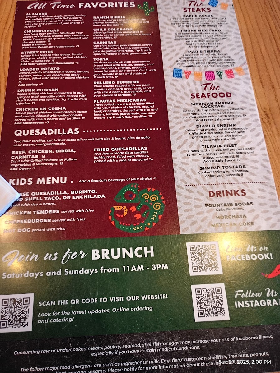 Appetizers like Queso Dip, Chori Queso, and Jalapeno Wrapped Bacon complement the main dishes well and fit naturally with both casual bites and larger group dining. For those who appreciate more traditional choices, enchiladas, tacos, and quesadillas featuring beef, chicken, or carnitas provide a satisfying taste of classic Mexican cuisine.