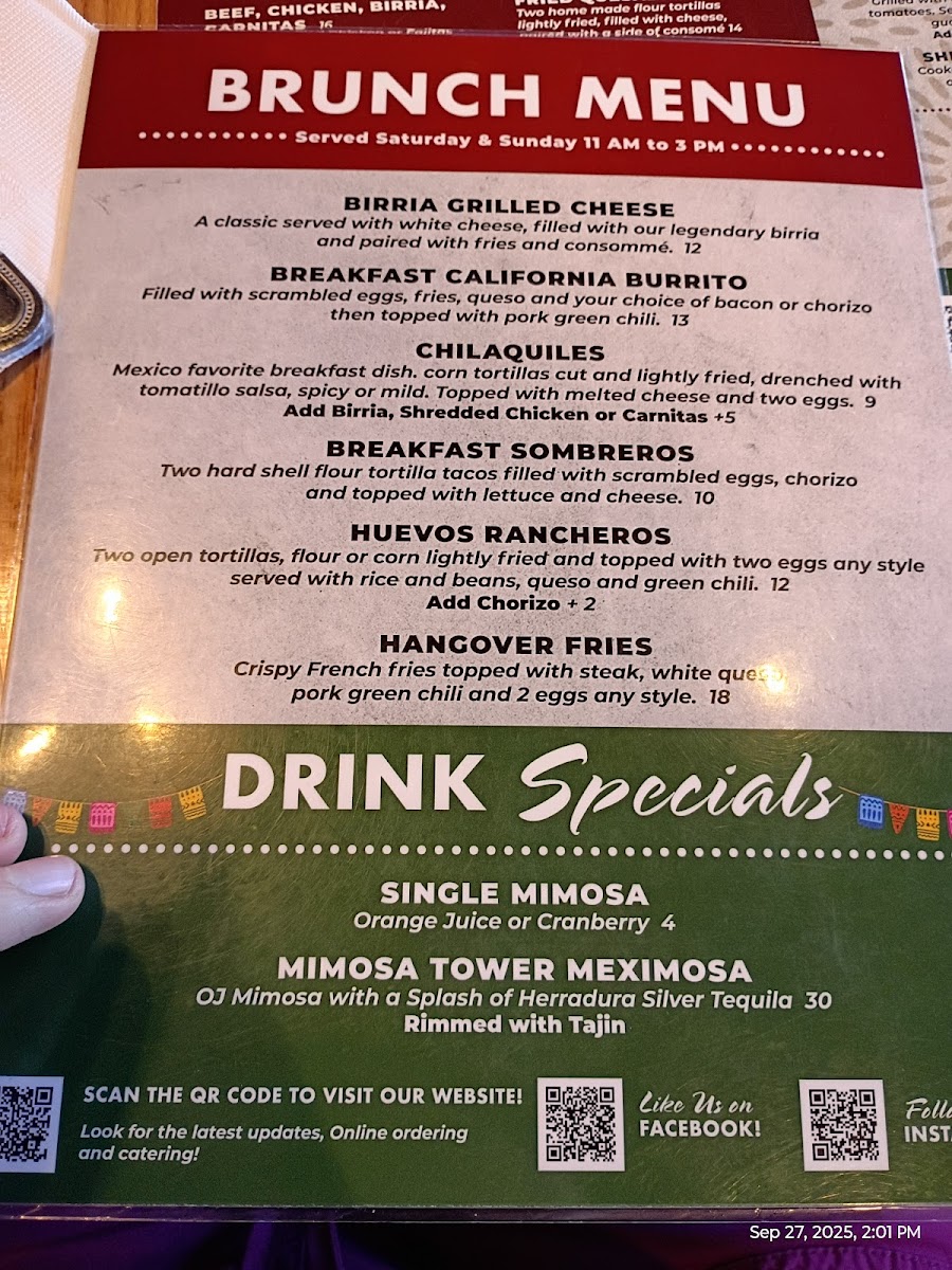 Whether you're settling in for a relaxed lunch or an evening gathering, you’ll find flavorful options like Deluxe Fajitas, Combination Chili Rellano with a Ground Beef Burrito, and the ever-popular Birria. Complementary nachos and fresh salsa set the tone for a meal meant to be savored at a comfortable pace, with drinks such as Mango Margaritas or Margarita Towers adding a refreshing note to the experience.